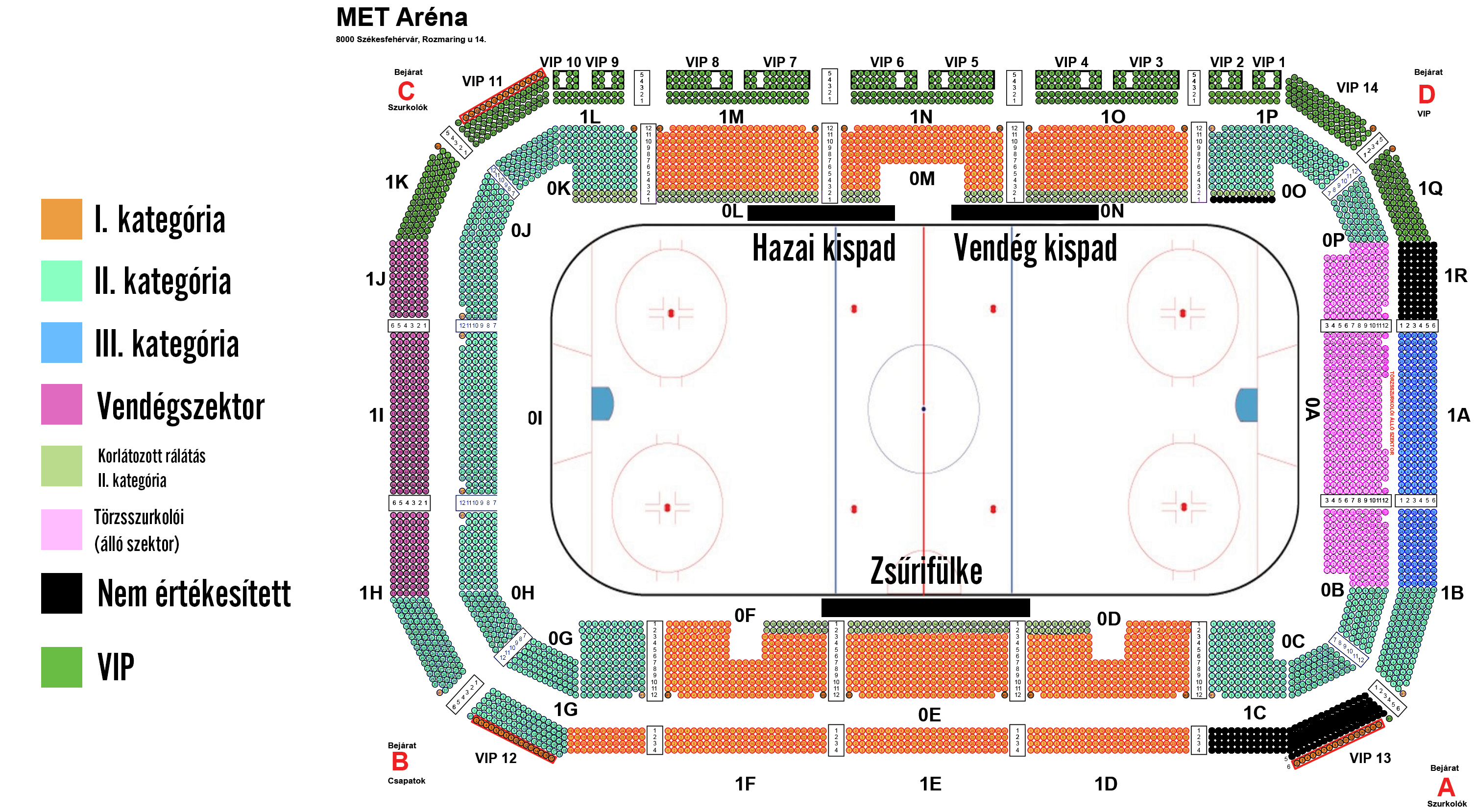 Az M betűjelű helyek, valamint a mellettük jobbra, illetve balra található helyek a mozgáskorlátozottak és kísérőik számára kialakított helyek. Az M betűjelű helyekre való bérlet vásárlásával kapcsolatban kérjük, érdeklődjön a berlet@fehervarav19.hu címen.