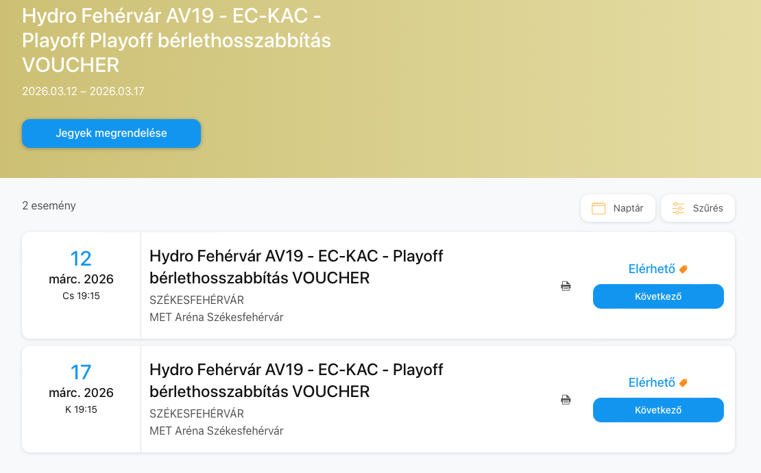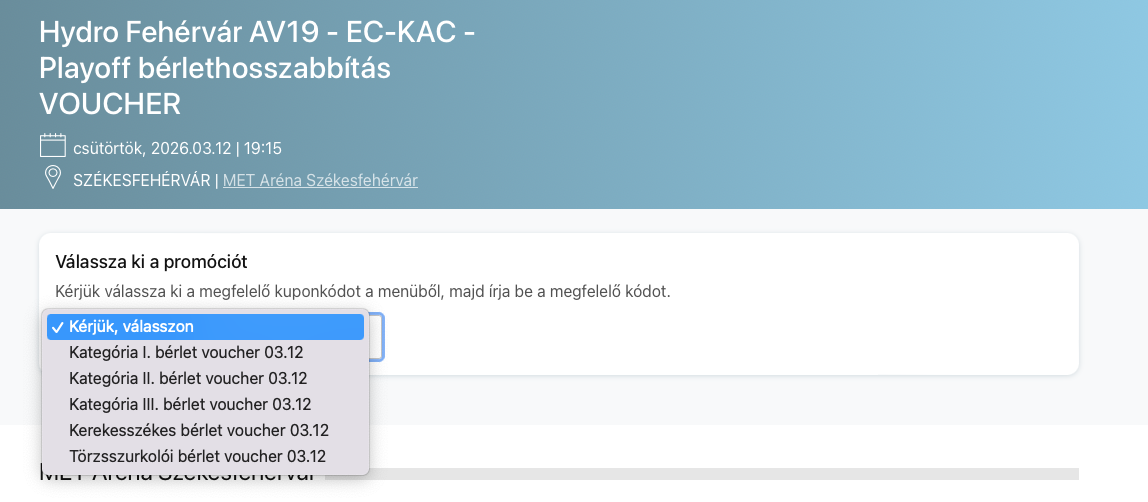 Bejelentkezés után a Bérlethosszabbítás - voucher eseményre kell kattintani és kiválasztani a megfelelő mérkőzést.