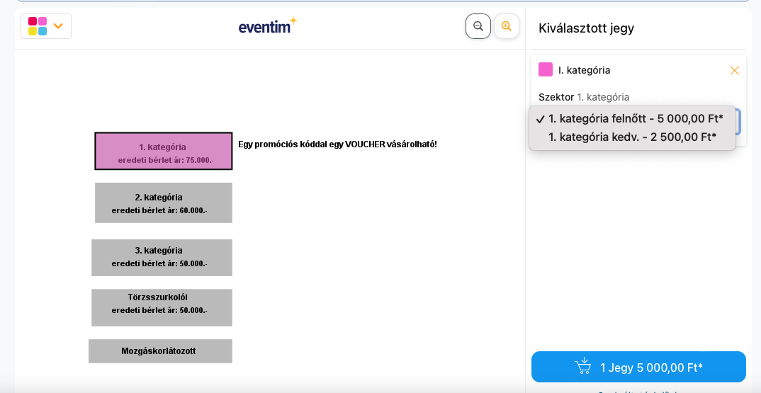 Végül a jobb alsó sarokban található kék "X Jegy xxxx Ft" gombra kattintva tehetők kosárba a jegyek.